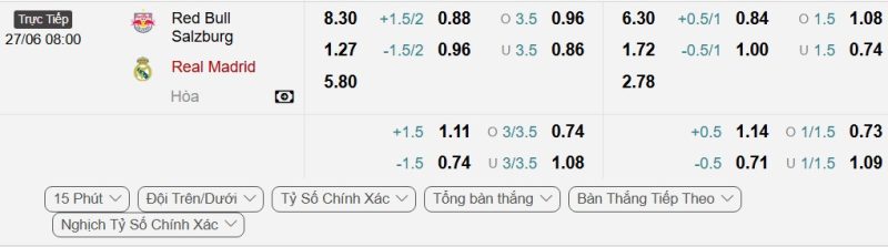 - Kèo tỷ số bóng đá hiệp 1: Red Bull Salzburg 1-2 Real Madrid