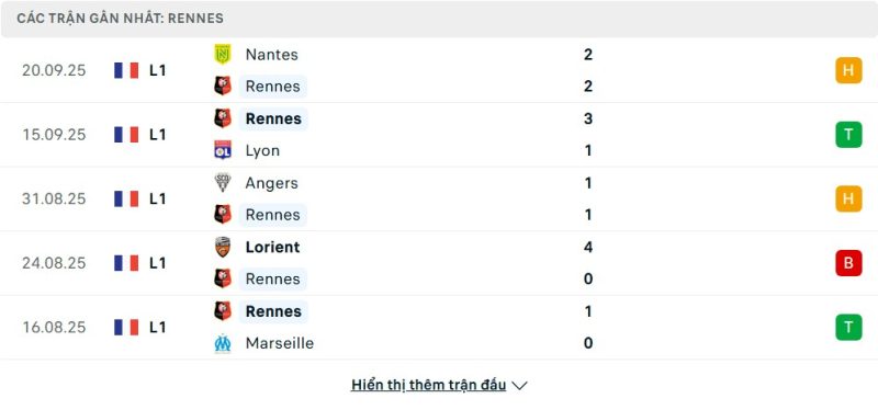 Rennes đang thể hiện phong độ thất thường ở giai đoạn đầu mùa. Sau 5 vòng đấu, họ giành được 8 điểm và đứng ở nhóm giữa bảng xếp hạng. Những kết quả đáng chú ý là chiến thắng 3-1 trước Lyon và trận thắng tối thiểu trước Marseille, cho thấy khả năng bùng nổ trong các trận đấu lớn. Tuy nhiên, Rennes cũng để thua Lorient tới bốn bàn và hòa hai trận đáng tiếc trước Angers và Nantes. Điều này khiến đội bóng vẫn chưa thật sự ổn định, nhưng họ vẫn được đánh giá cao nhờ lợi thế sân nhà cùng sự tự tin sau chuỗi trận vừa qua.