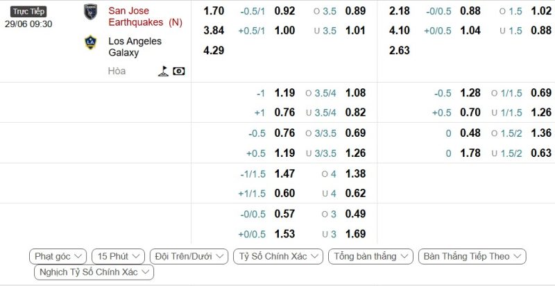 Bảng Tỷ lệ kèo bóng đá San Jose Earthquakes vs LA Galaxy