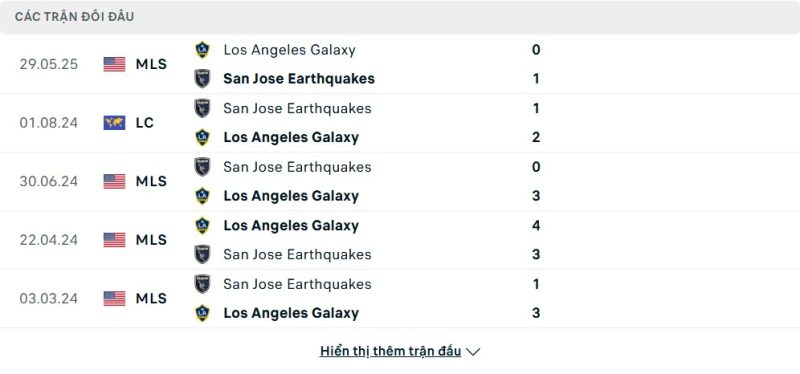 Thành tích đối đầu của San Jose Earthquakes vs LA Galaxy