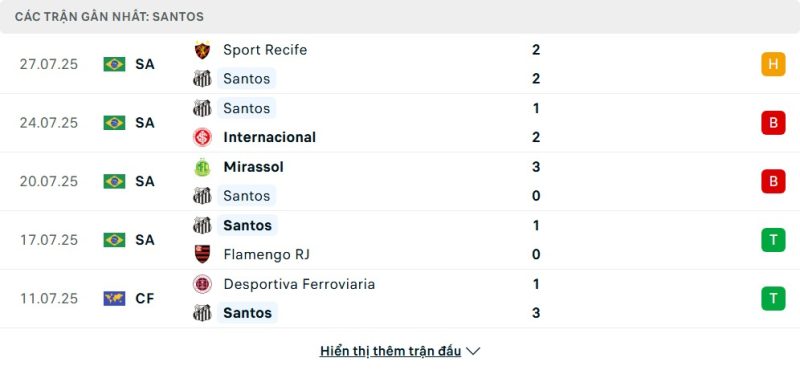 Phong độ gần đây của Santos khá bất ổn. Họ hiện đang đứng thứ 19 trên bảng xếp hạng với 10 điểm sau 16 trận đấu. Trong 5 trận gần nhất trên mọi đấu trường, Santos có 1 chiến thắng, 1 trận hòa và 3 trận thua. Đáng chú ý, họ đã để thua 1-2 trước Internacional và thua đậm 0-3 trước Mirassol. Điều này cho thấy Santos cần phải cải thiện sự ổn định.