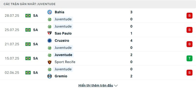 5 trận gần nhất của Juventude: L-L-L-W-L