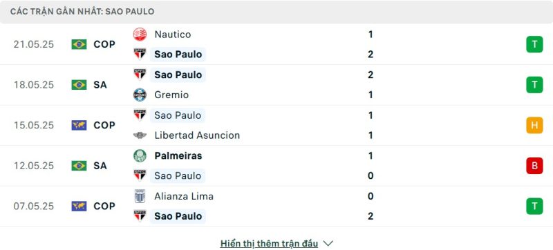 5 trận gần nhất của São Paulo: W-W-D-L-W