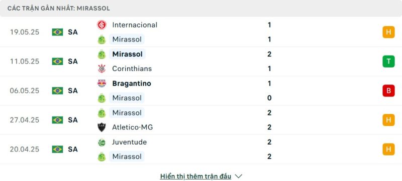 5 trận gần nhất của Mirassol: D-W-L-D-D