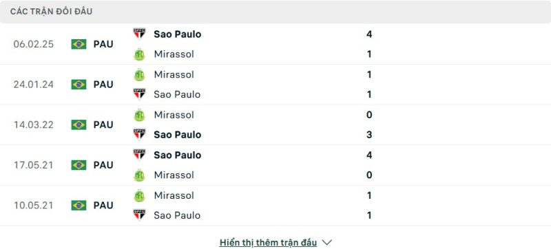 Một điểm đáng chú ý là trong 3/4 cuộc chạm trán gần đây giữa hai đội, tổng số bàn thắng đều vượt mốc 2 bàn. Điều này cho thấy cặp đấu này thường diễn ra với thế trận cởi mở và giàu tính giải trí, đặc biệt khi São Paulo chủ động chơi tấn công còn Mirassol không ngại đáp trả.