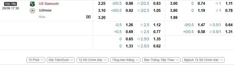 - Kèo tỷ số bóng đá hiệp 1: Sassuolo 0-2 Udinese