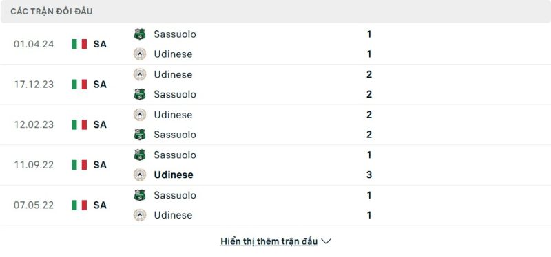 Thành tích đối đầu của Sassuolo vs Udinese