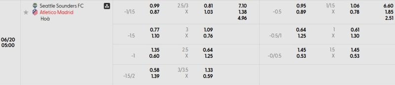 Bảng Tỷ lệ kèo bóng đá Seattle Sounders FC vs Atlético Madrid