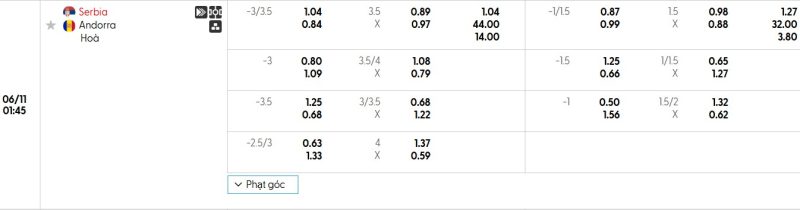 Bảng Tỷ lệ kèo bóng đá Serbia vs Andorra