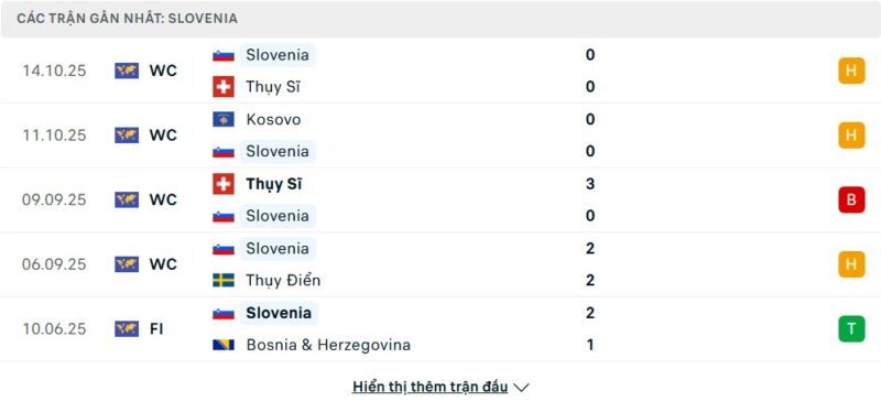 5 trận gần nhất của Slovenia: D-D-L-D-W