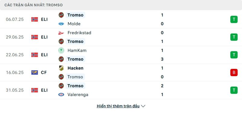 Bên kia chiến tuyến, Tromsø đang có phong độ cực kỳ ổn định. Chiến thắng tối thiểu 1-0 trước Molde ở vòng gần nhất là minh chứng rõ ràng cho lối chơi kỷ luật và hiệu quả mà HLV Jørgen Vik đang áp dụng. Trong 6 trận gần đây tại giải quốc nội, Tromsø giành tới 5 chiến thắng và chỉ để thua đúng 1 lần, đồng thời giữ sạch lưới 3 trận. Họ hiện đang đứng trong nhóm dẫn đầu và tiếp tục nuôi hy vọng cạnh tranh vé dự cúp châu Âu. Điểm mạnh của Tromsø nằm ở sự chắc chắn nơi hàng thủ và khả năng tận dụng tốt cơ hội khi phản công.