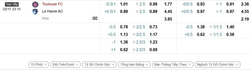 Bảng Tỷ lệ kèo bóng đá Toulouse vs Le Havre