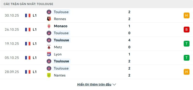 Thống kê phong độ gần đây Toulouse vs Le Havre