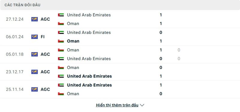Lịch sử đối đầu giữa UAE và Oman thường chứng kiến rất ít bàn thắng được ghi. Thống kê cho thấy phần lớn các trận đấu giữa họ đều kết thúc với tối đa 2 bàn. Điều này phản ánh sự tương đồng về trình độ và lối chơi chặt chẽ của cả hai đội. Ở một trận đấu có tính chất then chốt, mang ý nghĩa quyết định như thế này, sự thận trọng sẽ càng được đặt lên hàng đầu. Cả hai đội đều hiểu rằng một sai lầm nhỏ cũng có thể phải trả giá đắt, vì vậy một thế trận giằng co và khan hiếm bàn thắng là kịch bản rất dễ xảy ra.