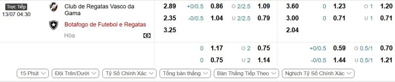 Bảng Tỷ lệ kèo bóng đá Vasco da Gama vs Botafogo