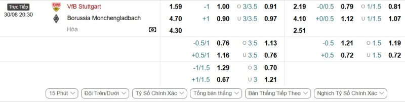 - Kèo tỷ số bóng đá hiệp 1: VfB Stuttgart 2-1 Borussia Mönchengladbach