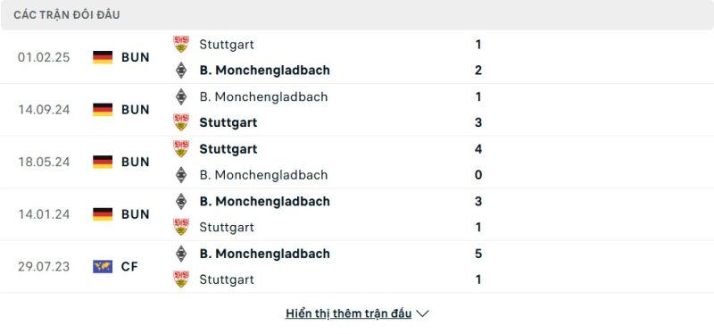 Thành tích đối đầu của VfB Stuttgart vs Borussia Mönchengladbach