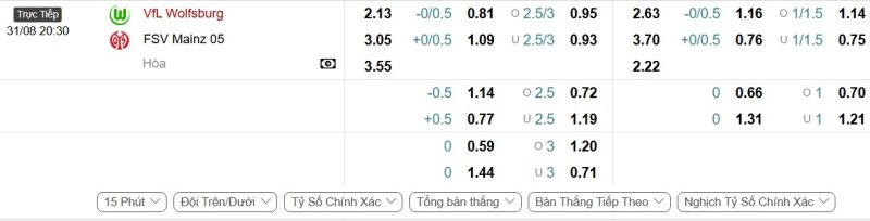 Bảng Tỷ lệ kèo bóng đá VfL Wolfsburg vs Mainz 05