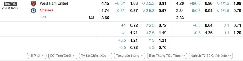 Bảng Tỷ lệ kèo bóng đá West Ham United vs Chelsea