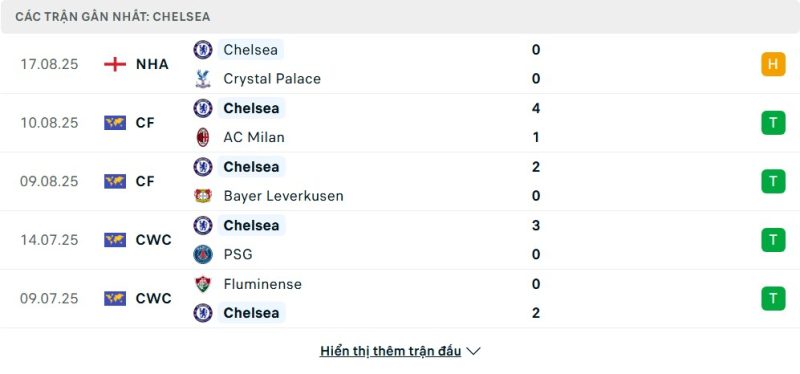 Bên kia chiến tuyến, Chelsea bắt đầu chiến dịch Premier League 2025/26 với một trận hòa 0-0 trước Crystal Palace, tạm thời đứng ở vị trí thứ 10. Dù chưa có được ba điểm trọn vẹn, màn trình diễn này cho thấy sự chắc chắn của hàng thủ. Phong độ của “The Blues” trước đó là vô cùng ấn tượng khi họ vừa đăng quang tại FIFA Club World Cup và có những chiến thắng thuyết phục trước các đối thủ mạnh như AC Milan hay PSG trong mùa hè. Với sự tự tin và đội hình chất lượng, Chelsea chắc chắn đặt mục tiêu giành chiến thắng đầu tiên của mùa giải.
